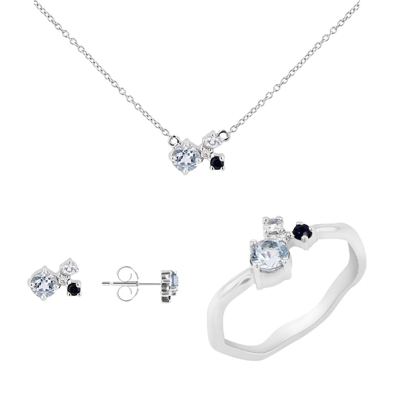 Silbernes Schmuckset mit Aquamarinen, Saphiren, Mondsteinen und Diamanten Halli