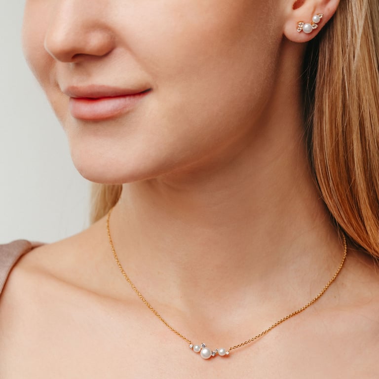 • die Perlenkette und die Ohrringe sind mit weißen Topasen verziert