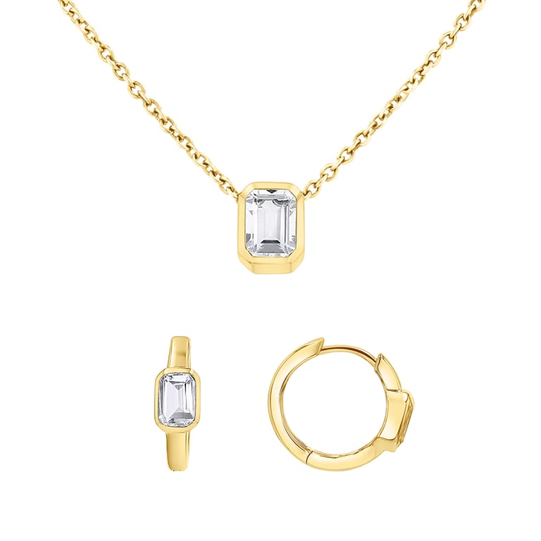 • weiße, rechteckige Topase sind in den Ohrringen und im Anhänger mit einer Bezelfassung befestigt