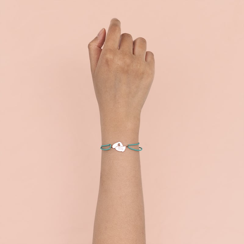 • niedliches String-Armband aus recyceltem Silber und umweltfreundlichen Schnüren aus PET-Flaschen, der Anhänger in Form von Babyfüßchen ist mit einem Herz und einem Namen oder einem anderen Text Ihrer Wahl verziert