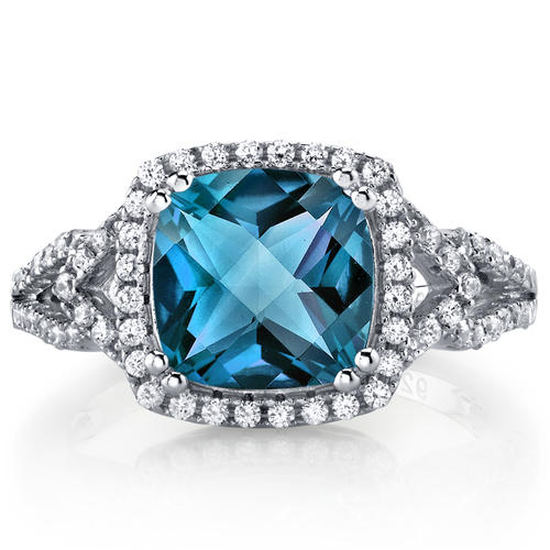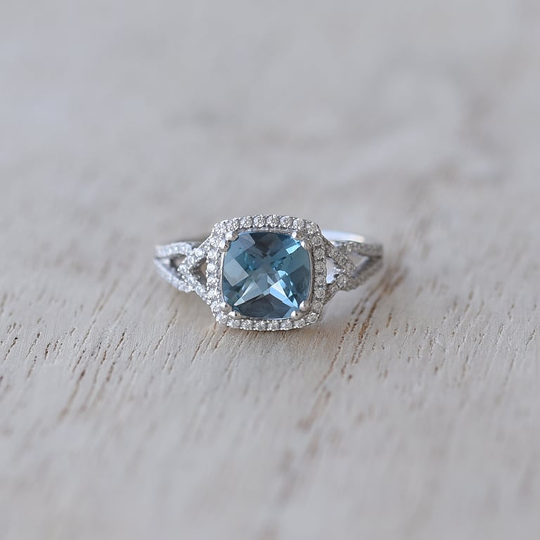 • der himmelblaue Topas in Kissenform wird von funkelnden Zirkonia umgeben