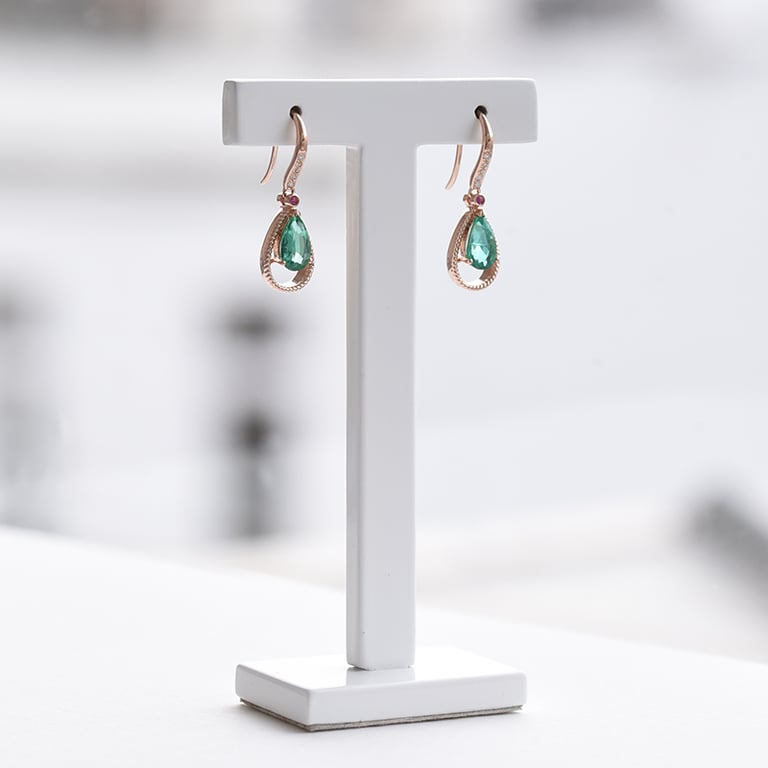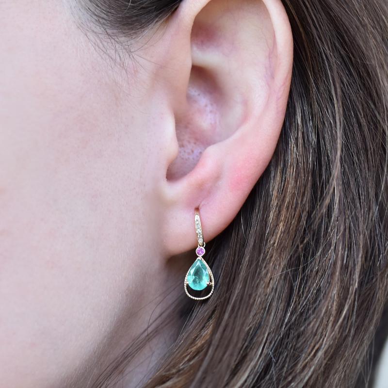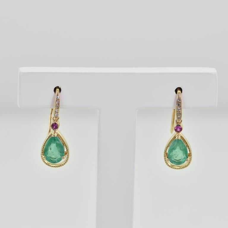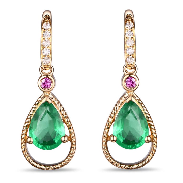 • eindrucksvolle Smaragde werden in diesen Ohrringen von Rubinen und Diamanten begleitet