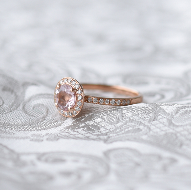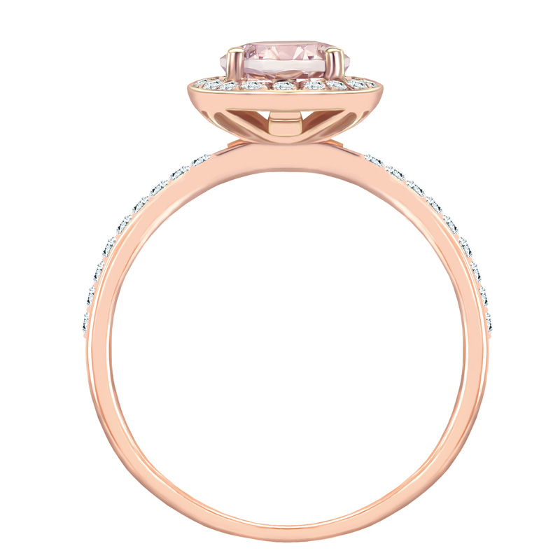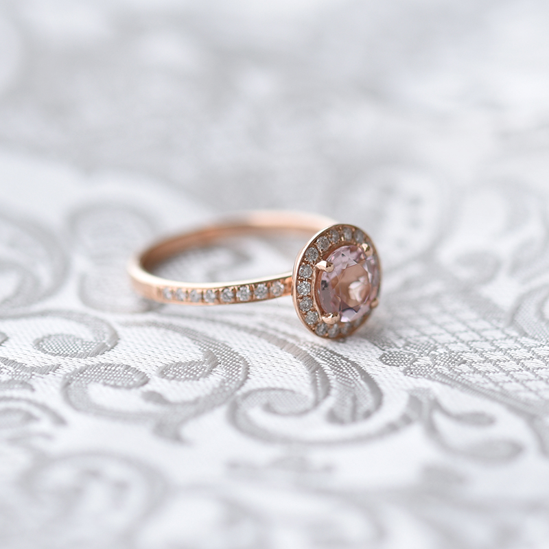 • extravaganter Verlobungsring mit einem runden, pfirsichfarbenen Morganit in Krappenfassung umgeben von einem runden Halo mit Diamanten