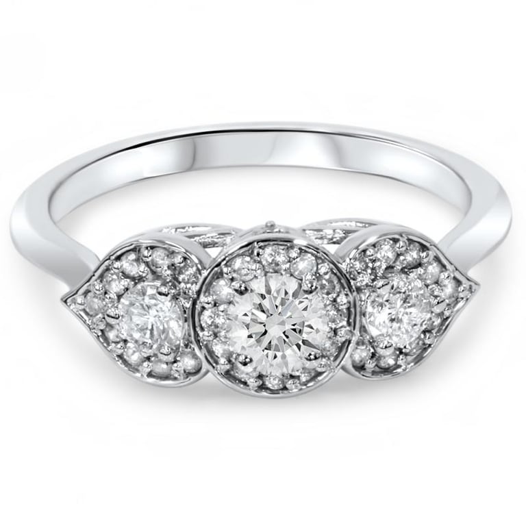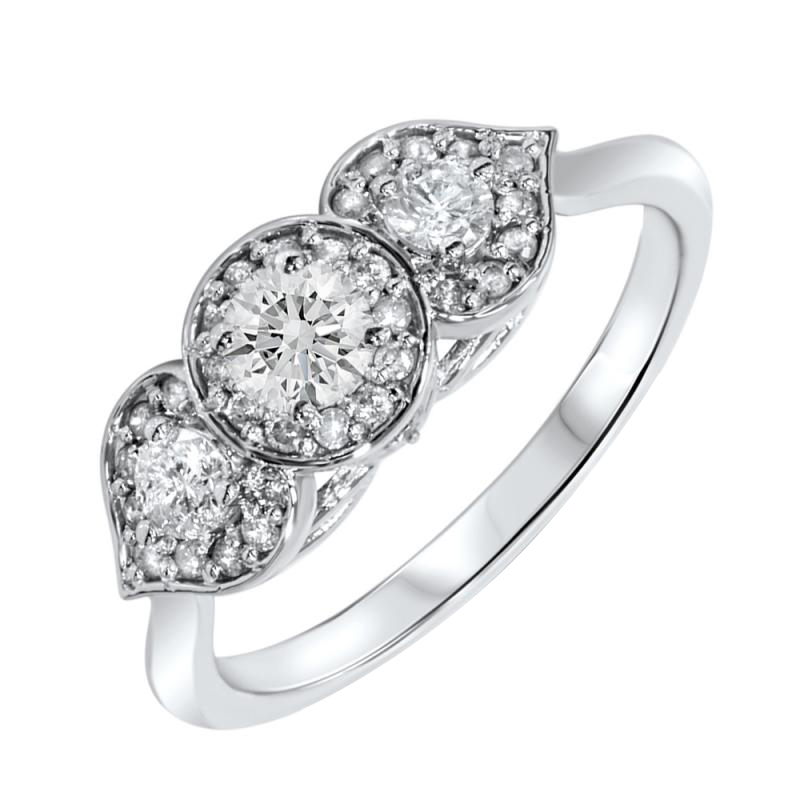 • der zentrale und die Seitendiamanten sind als Halo mit vielen kleineren Diamanten gestaltet