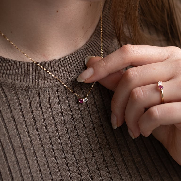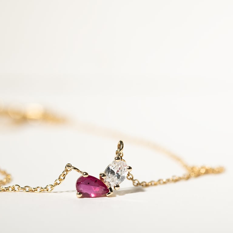 • ein tiefroter Rubin in Tropfenform und ein weißer ovaler Diamant verbinden sich zu einem einzigartigen Schmuckstück