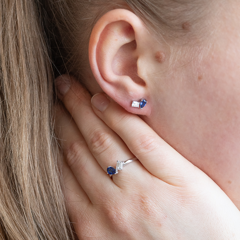 • der blauer Saphir in Tropfenform und der weiße Diamant im Smaragdschliff vereinen sich zu einem untrennbaren Ganzen