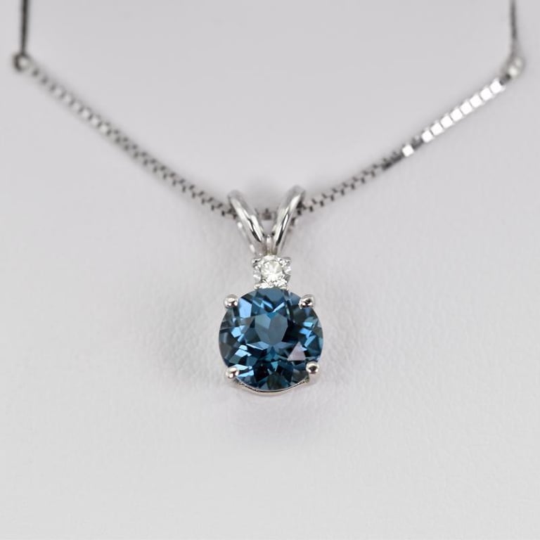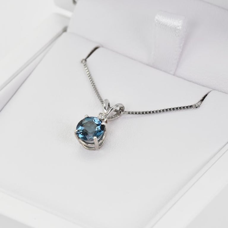 • der runde Topas in Londoner Blau weckt Assoziationen an unbeschwerte Sommertage, auf ihm sitzt ein strahlender runder Diamant