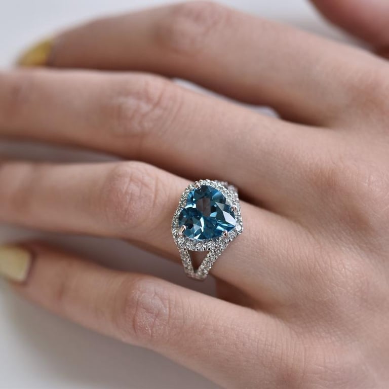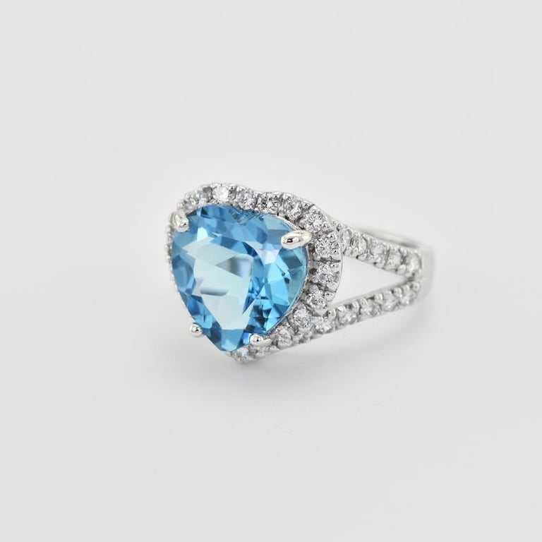 • ein herzförmiger himmelblauer Topas wird von einem Halo aus Zirkonia umrahmt