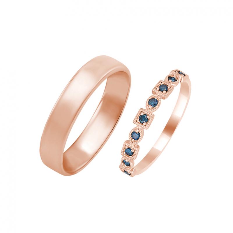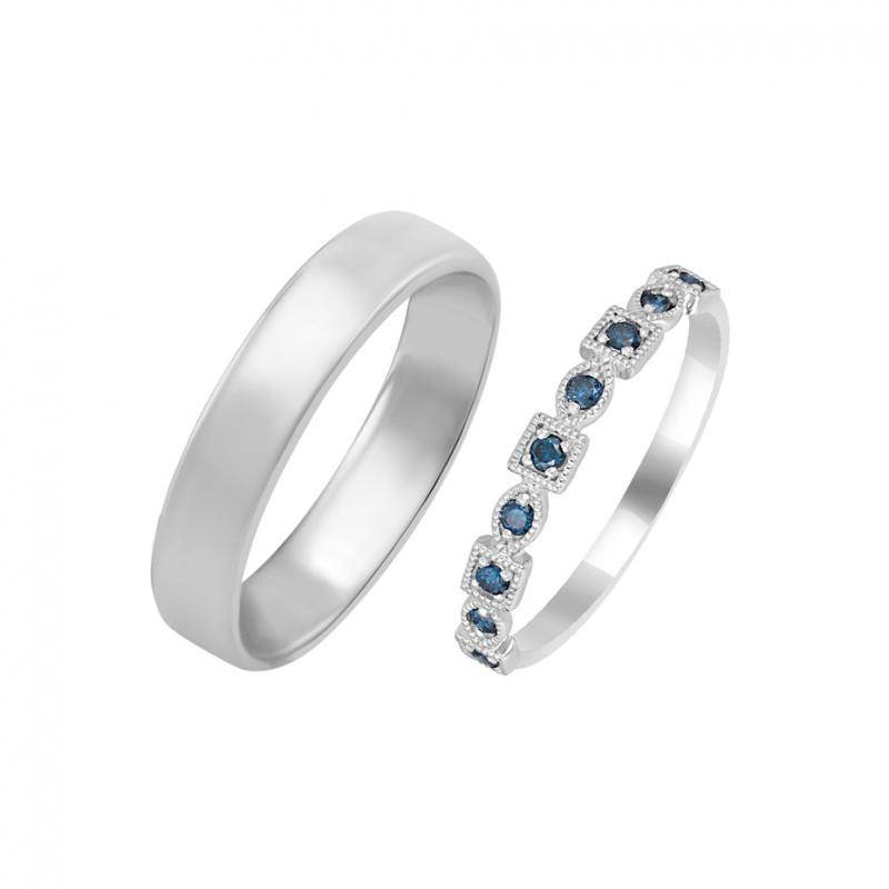 • außerordentliche Eheringe mit einem klassischen Ring und einem zarten Vintage-Ring mit blauen Diamanten, die eckig und oval gefasst sind