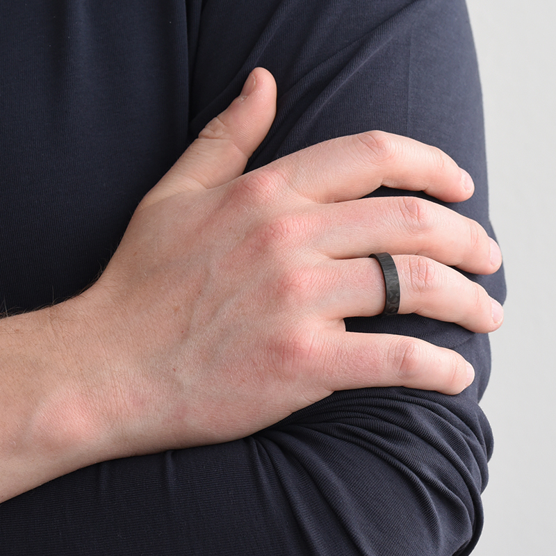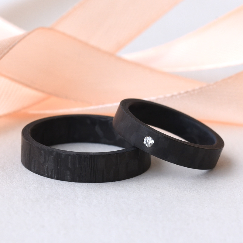• Trauringe aus Carbon ergänzt durch einen glänzenden Diamanten