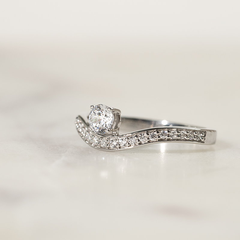 • ein runder, im Labor gezüchteter Diamant ist in einen elegant gewellten Ring gefasst