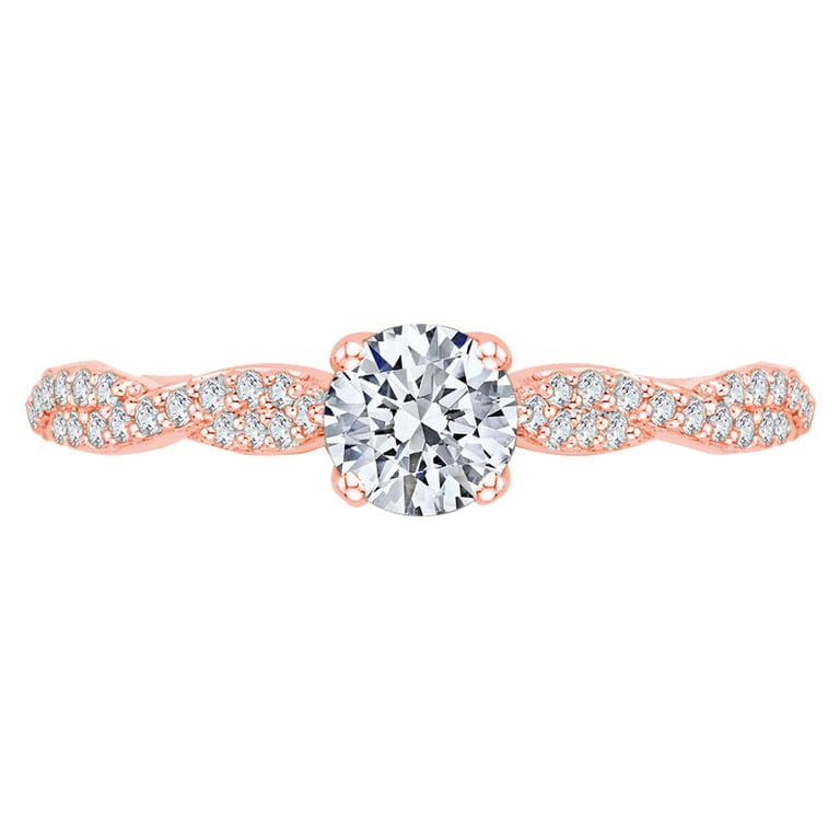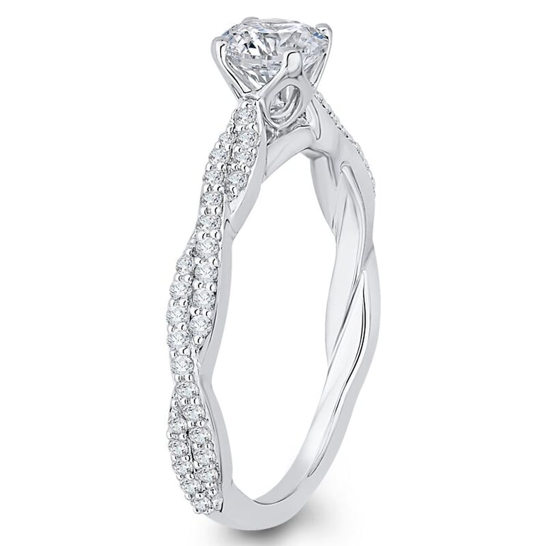 • den Ring mit einem verflochtenen Band besetzt mit Diamanten krönt ein 0.75 ct grosser Solitaire
