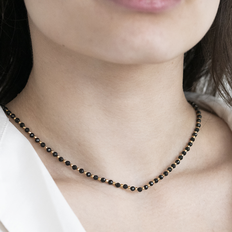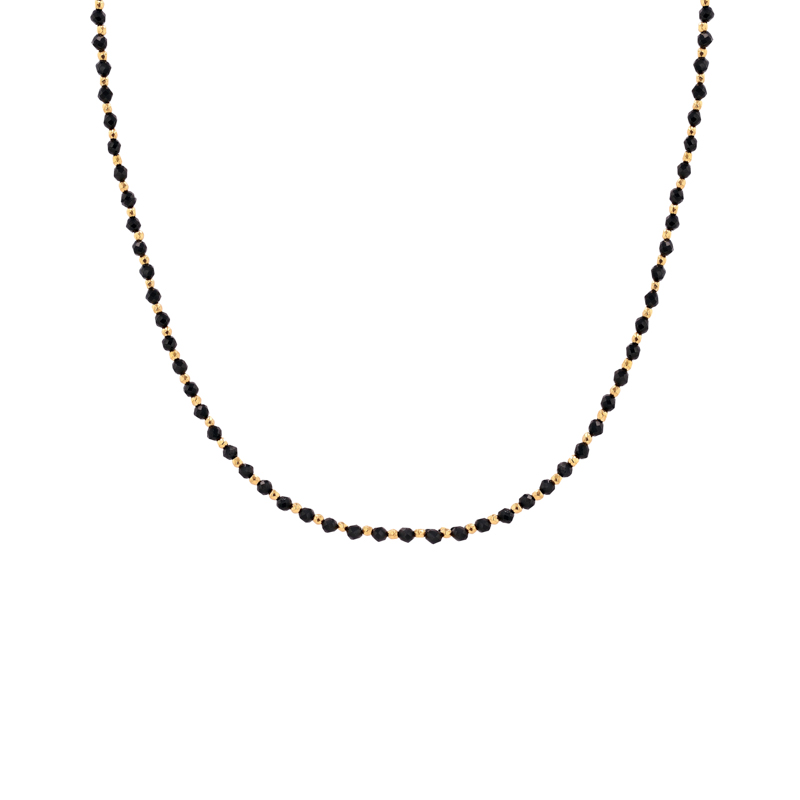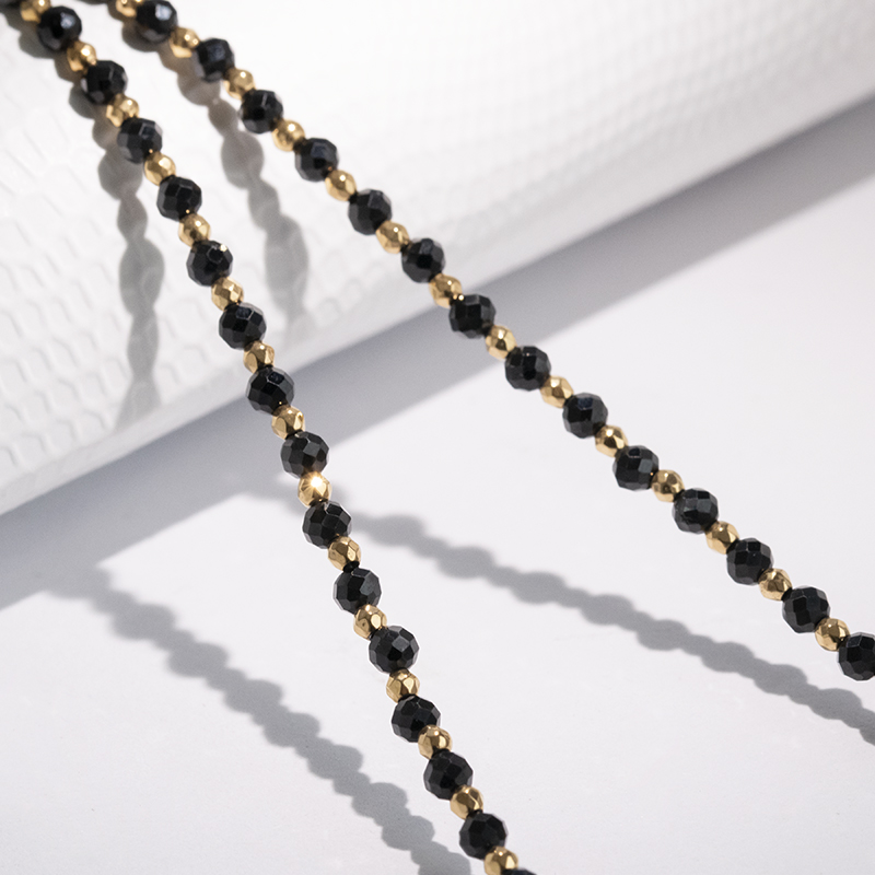 • eine bezaubernde Kette, die durch den Kontrast von schwarzen Spinell-Perlen und vergoldeten Hämatith-Kugeln auffällt