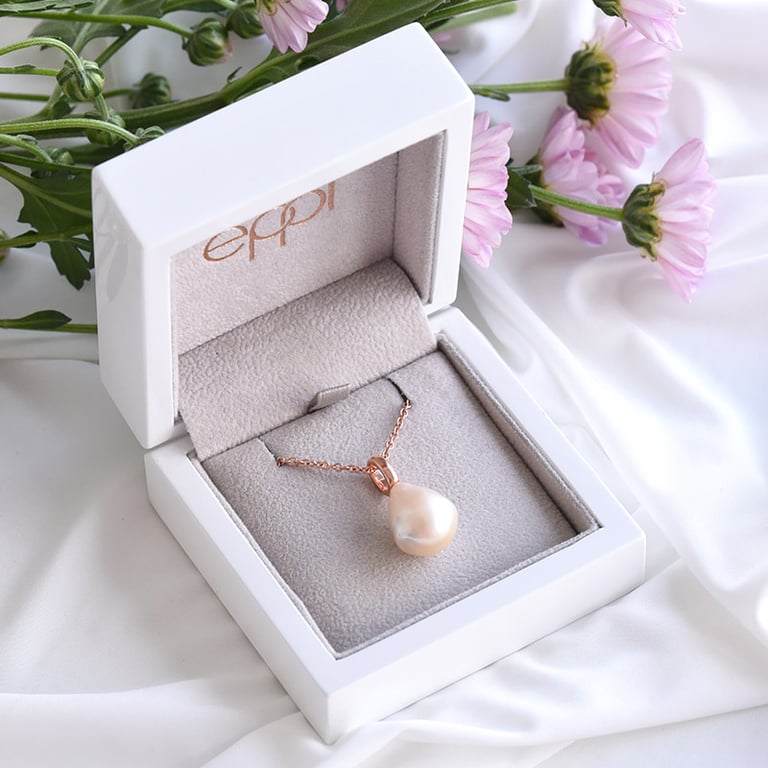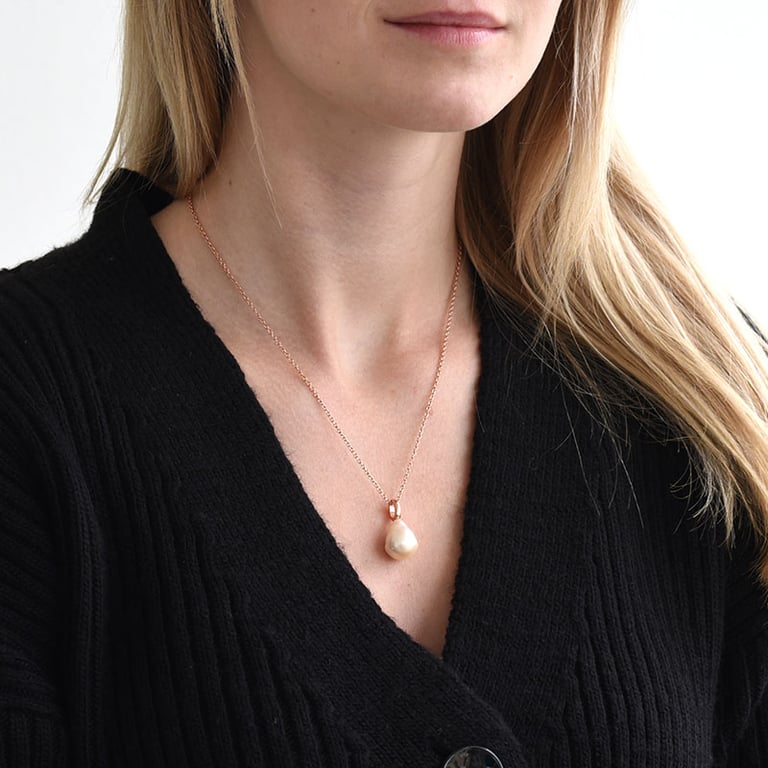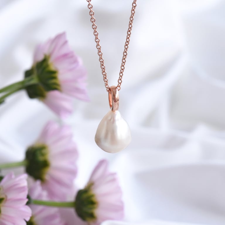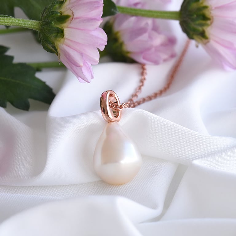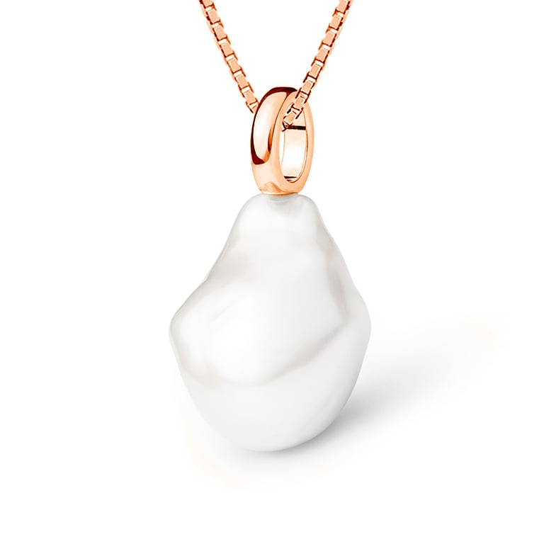 • die Perle in einer unreglmäßigen barocken Tropfenform fesselt durch ihr einzigartiges Aussehen in dem rosa vergoldeten Anhänger