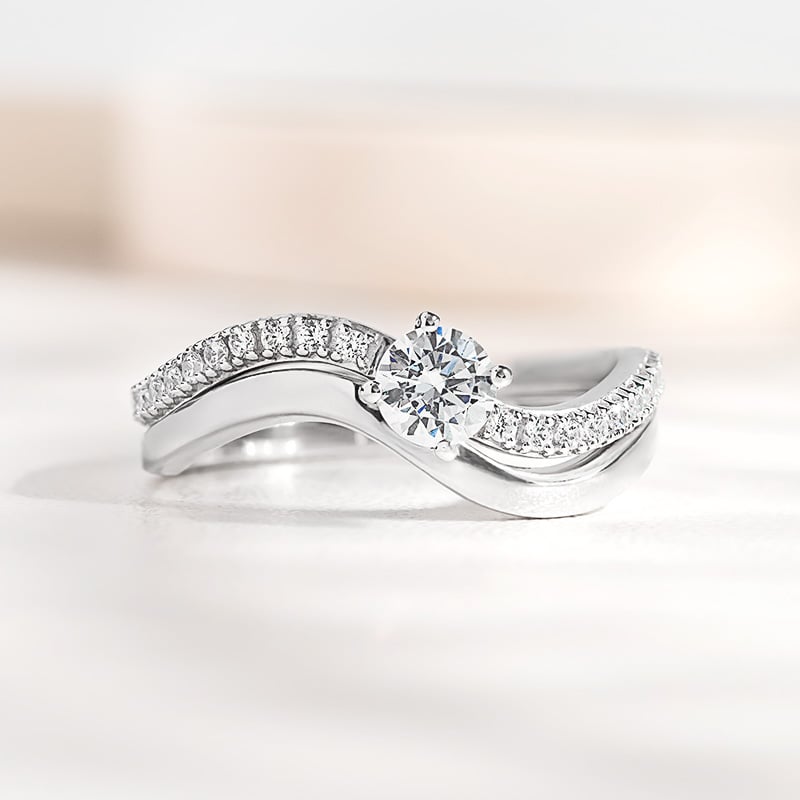 • die Einzigartigkeit des Verlobungsrings wird durch den sanft gewellten Ehering noch unterstrichen