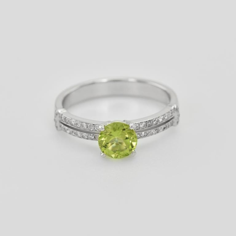 • Verlobungsring aus Weißgold mit Olivin und vielen Diamanten