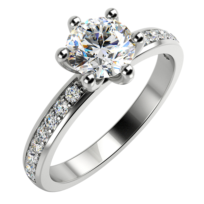 • der runde Diamant sitzt auf einer diamantenbesetzten Ringschiene, die ihn fast schweben lässt