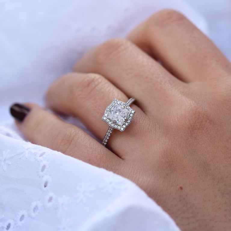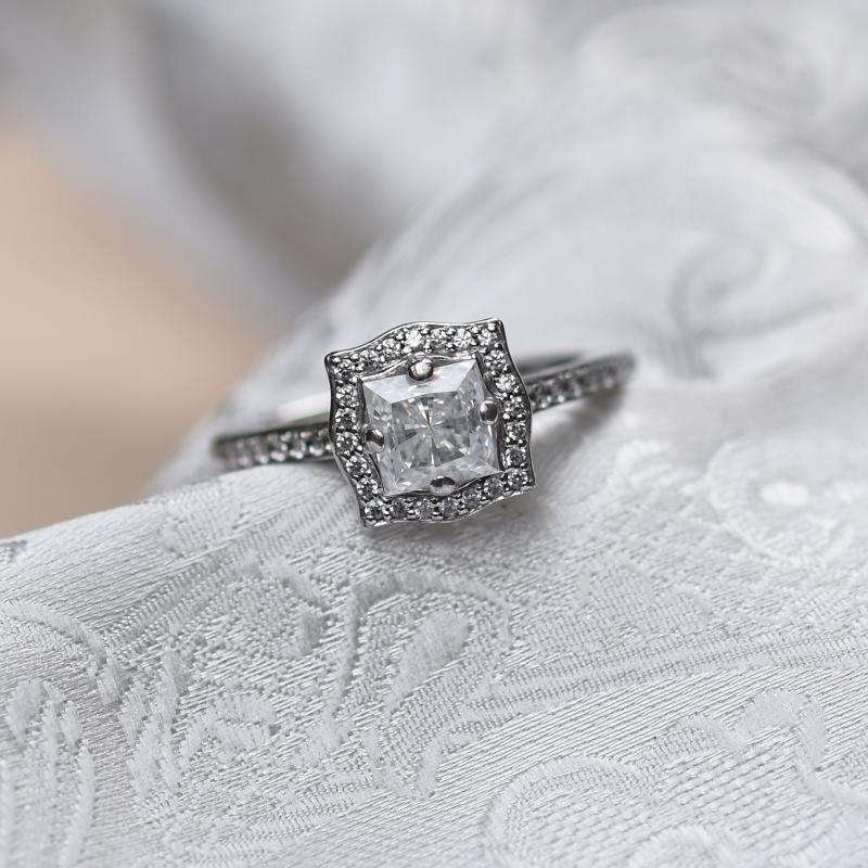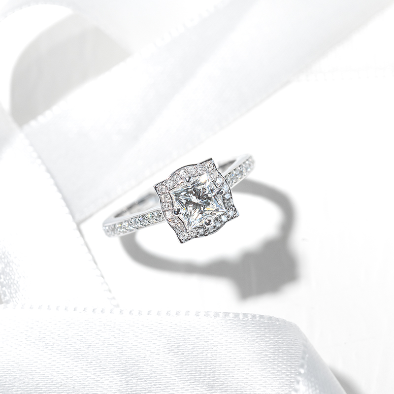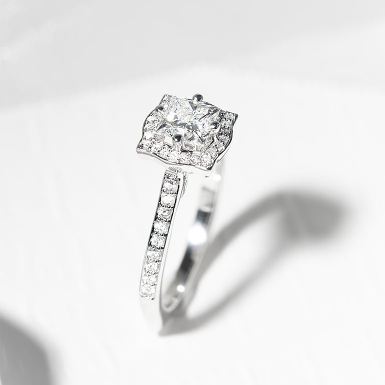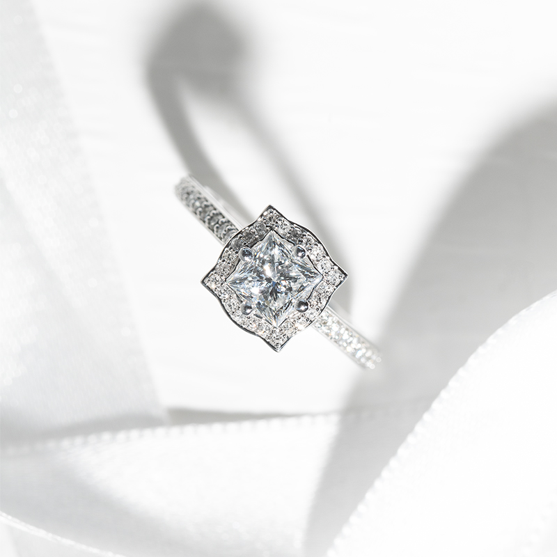 • der Diamant im Prinzessschliff entfacht sein besonderes Feuer in einem Halo aus Diamanten
