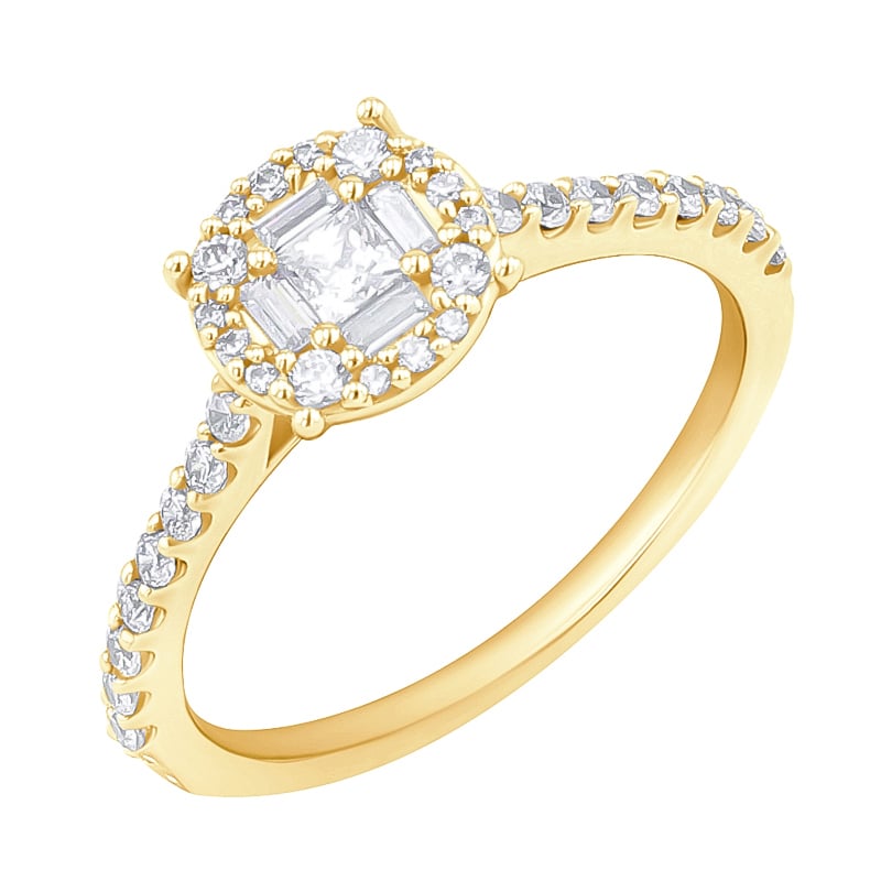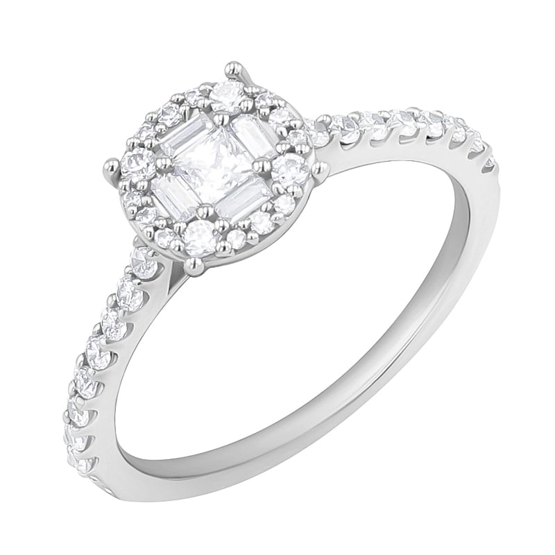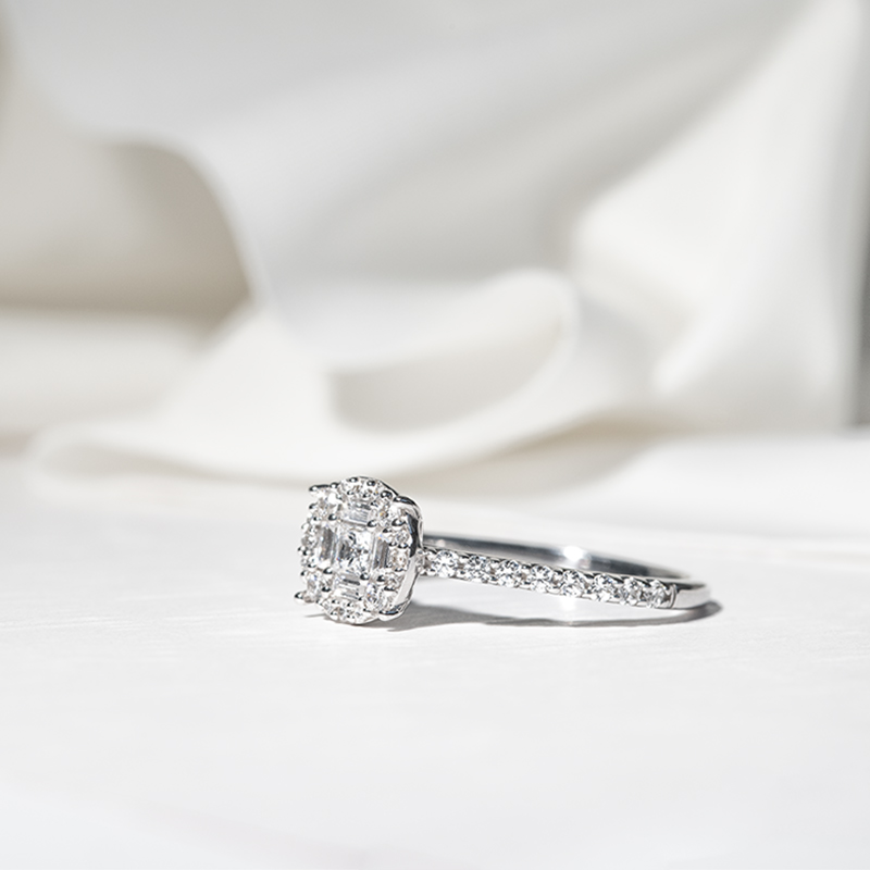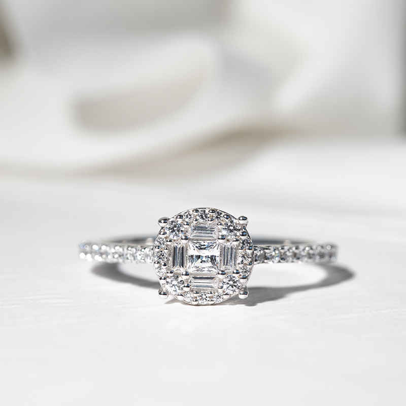 • in der Mitte befindet sich eine Kombination aus Diamanten, der zentrale Stein im Prinzessinnenschliff ist von vier Baguette-Diamanten umgeben
