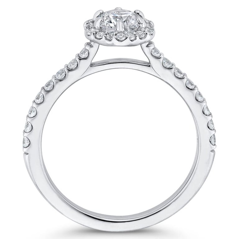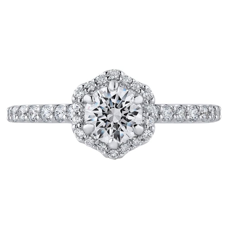 • den Ring in Weissgold ziert ein sechseckiges Halo aus Diamanten mit einem runden Halbkaräter in der Mitte