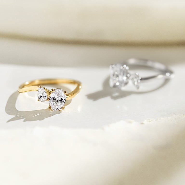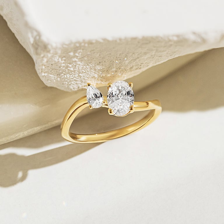 • er wird von zwei Lab Grown Diamanten dominiert - einer tropfenförmig, der andere oval -, die zusammen eine perfekte Harmonie bilden