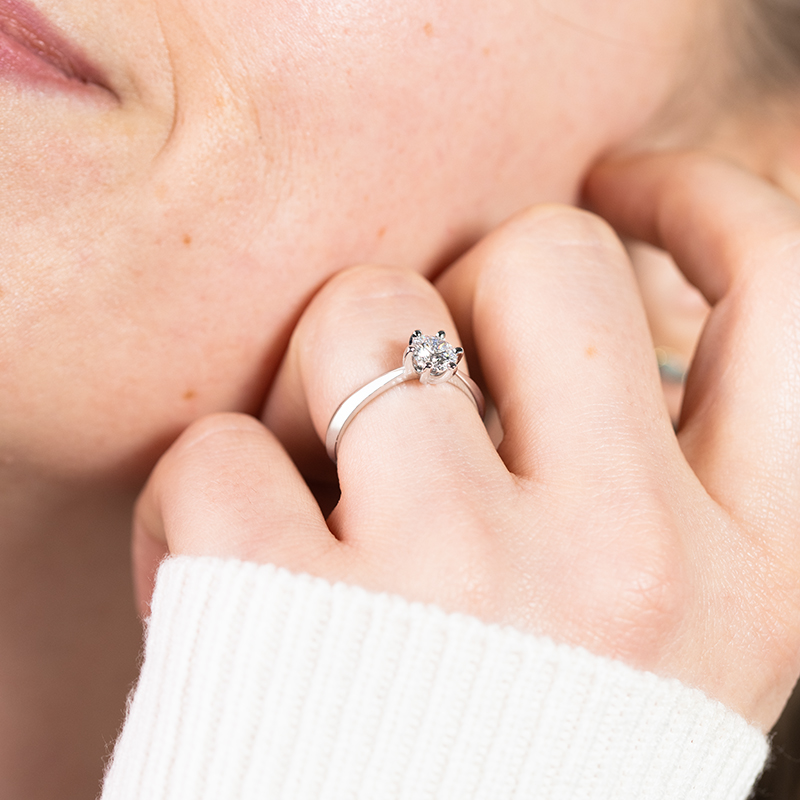 • die klassische Fassung in sechs Krappen betont den Glanz und das Funkeln des Diamanten