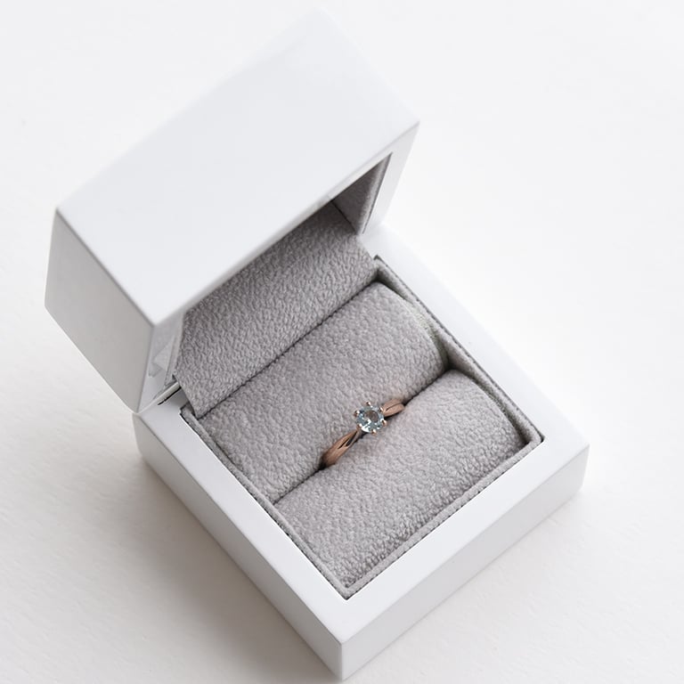 • dieser Ring in Roségold hat einen klaren, blauen Aquamarin im Zentrum