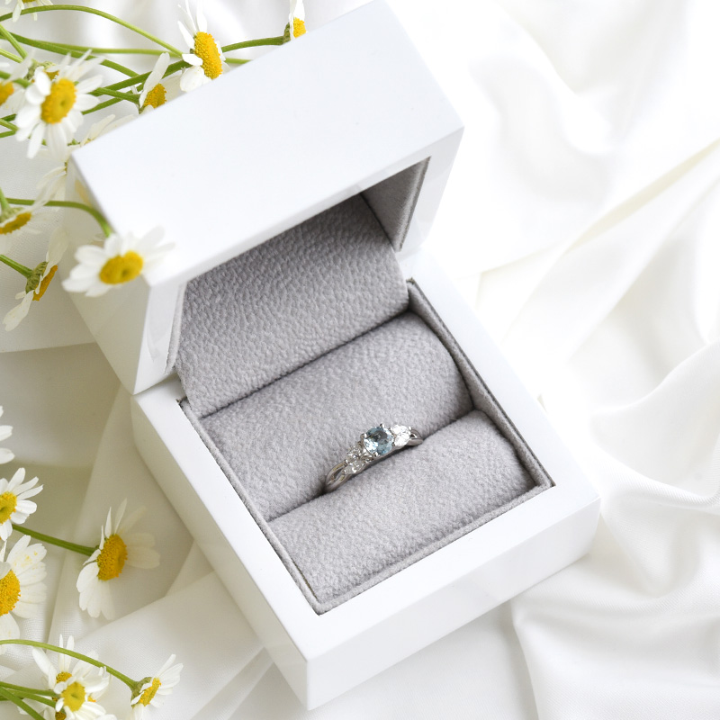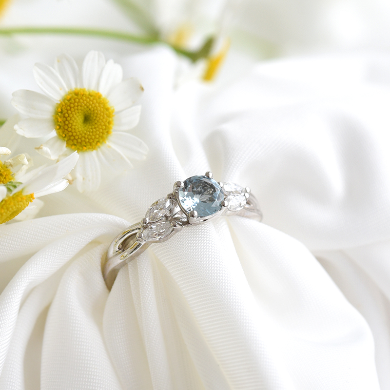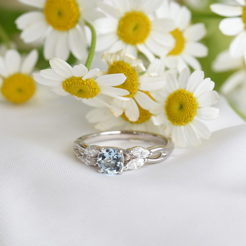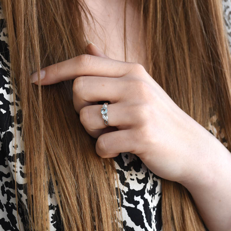 • Verlobungsring mit Aquamarin ergänzt durch seitliche Marquise-Moissaniten