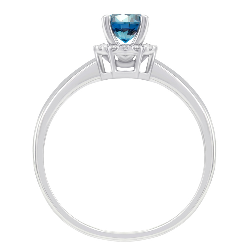 • den Ring schmückt ein runder blauer Diamant in Krappenfassung