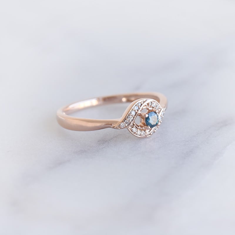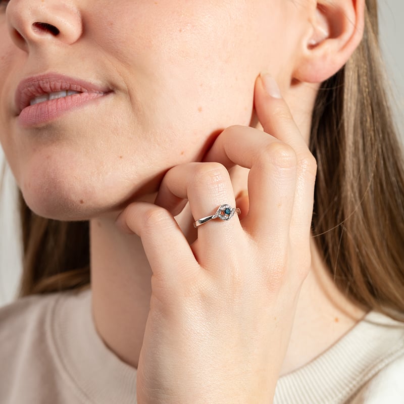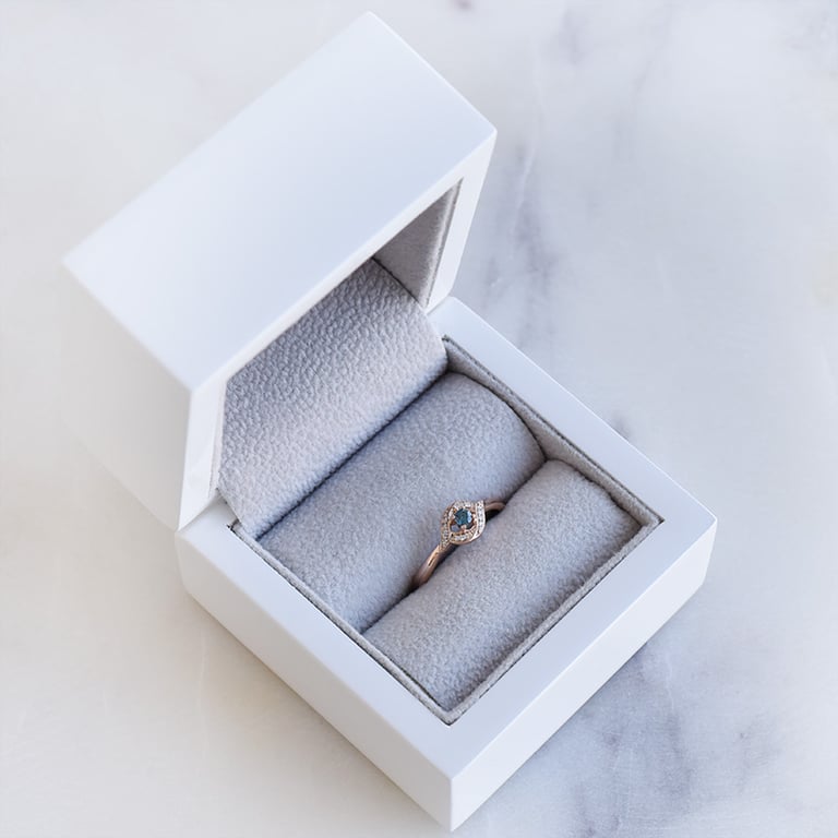 • der dezente Verlobungsring bezaubert mit seinem blauen Diamanten