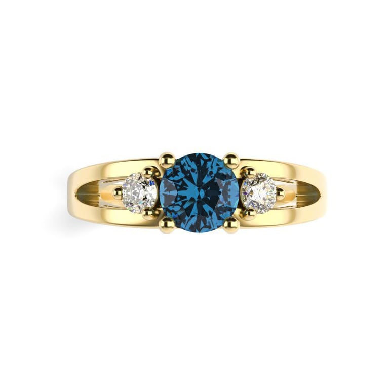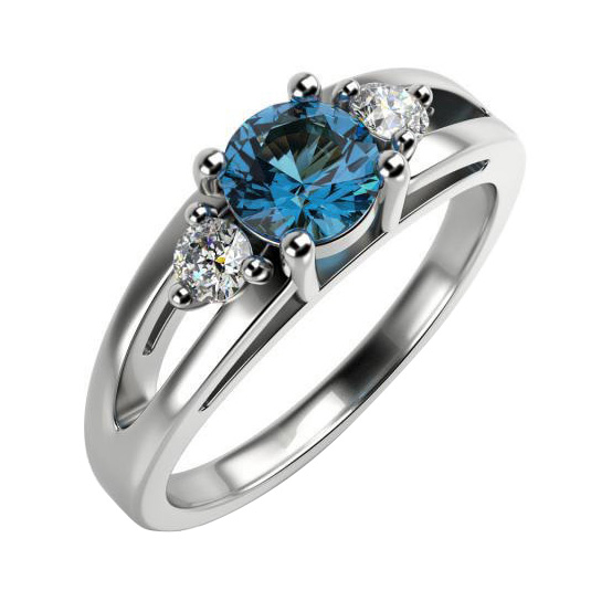 • der blaue Stein ist in Krappen gefasst von zwei runden weißen Diamanten umgeben