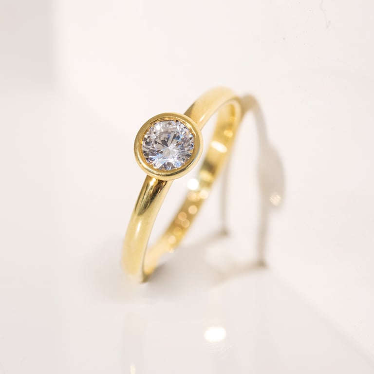• bei diesem Solitärring ist der runde Diamant in einer Bezelfassung ein besonderer Blickfang