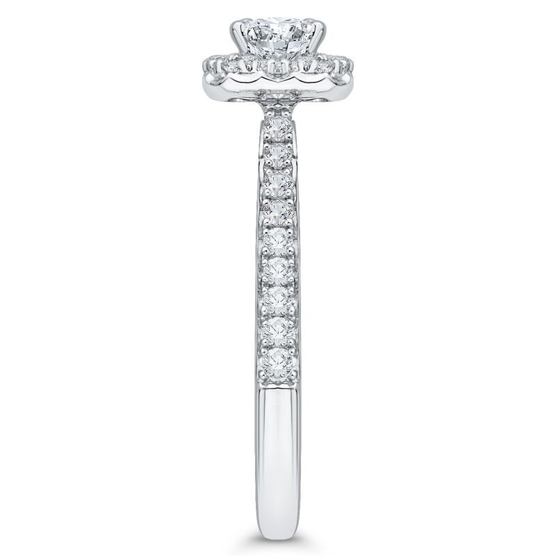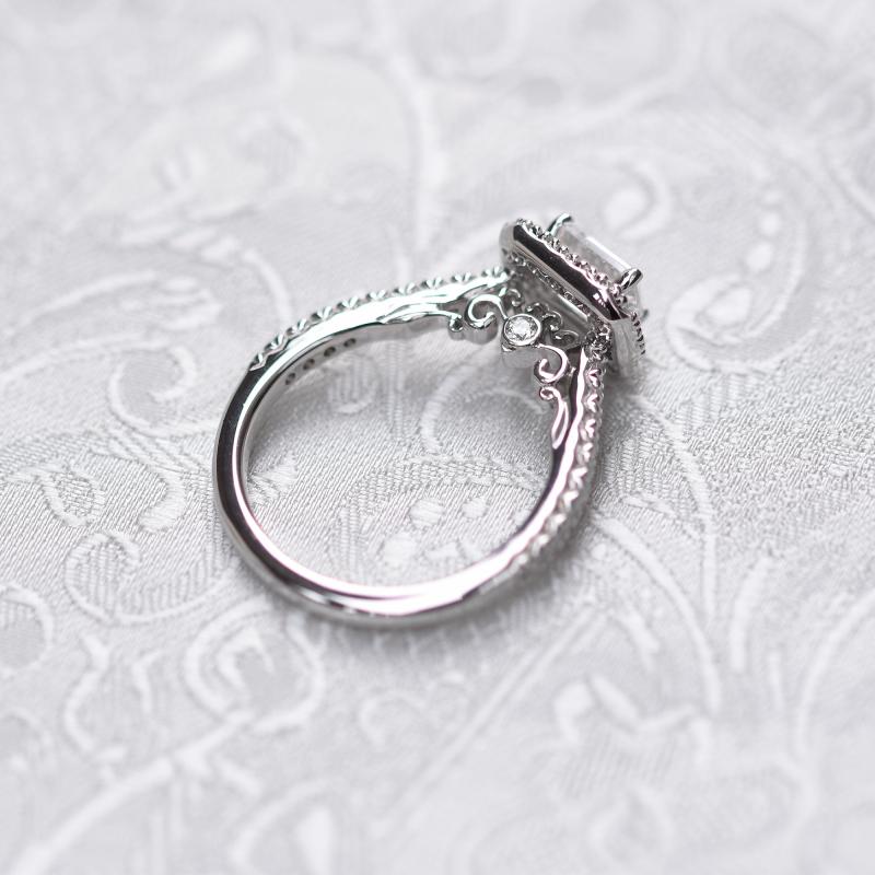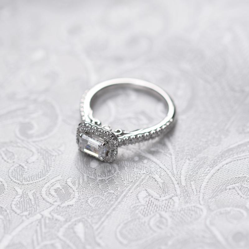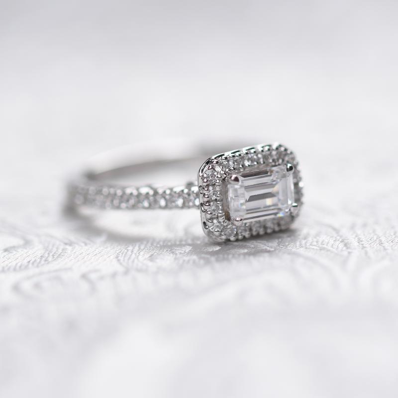 • dieser Ring mit einem 0.75 ct Diamanten im Smaragdschliff umgeben von einem Halo an Diamanten kann nichts anderes als bleibenden Eindruck hinterlassen
