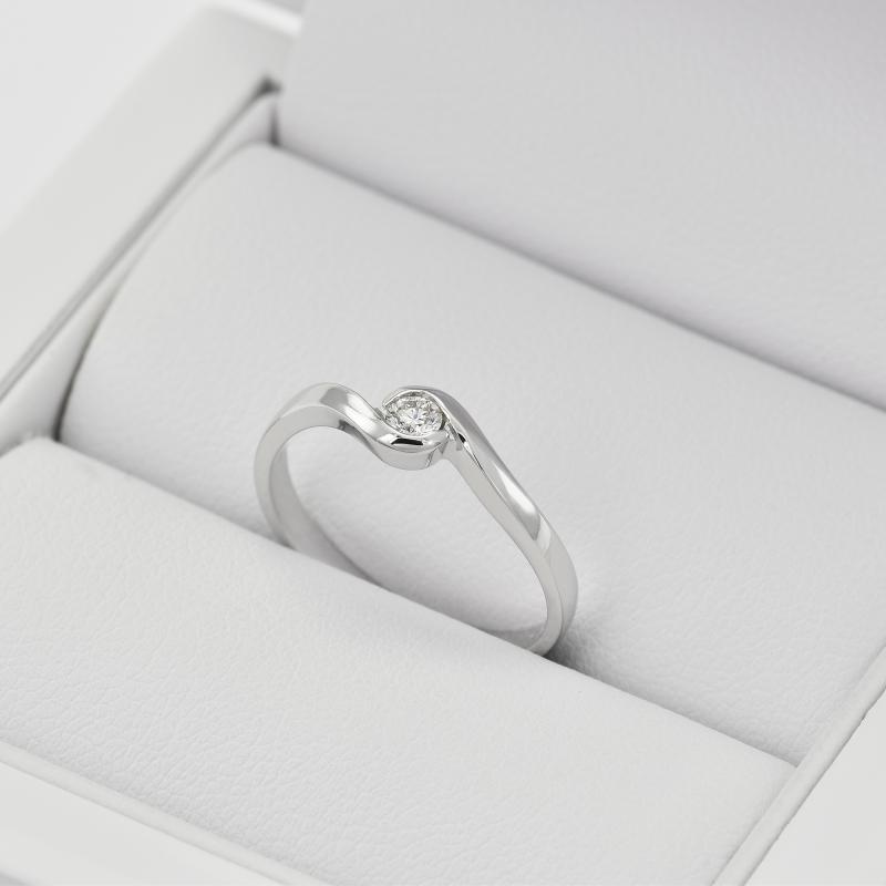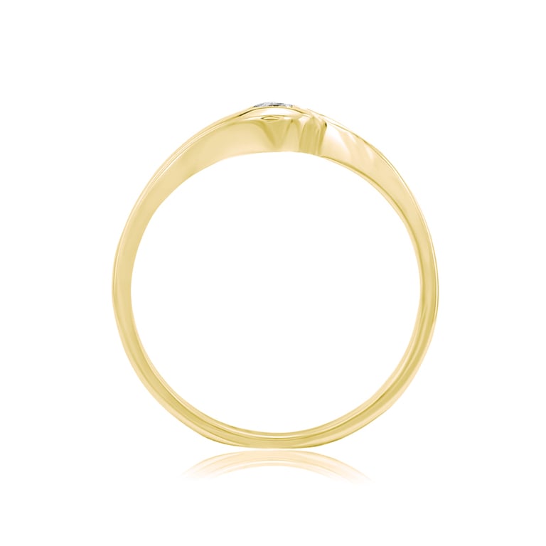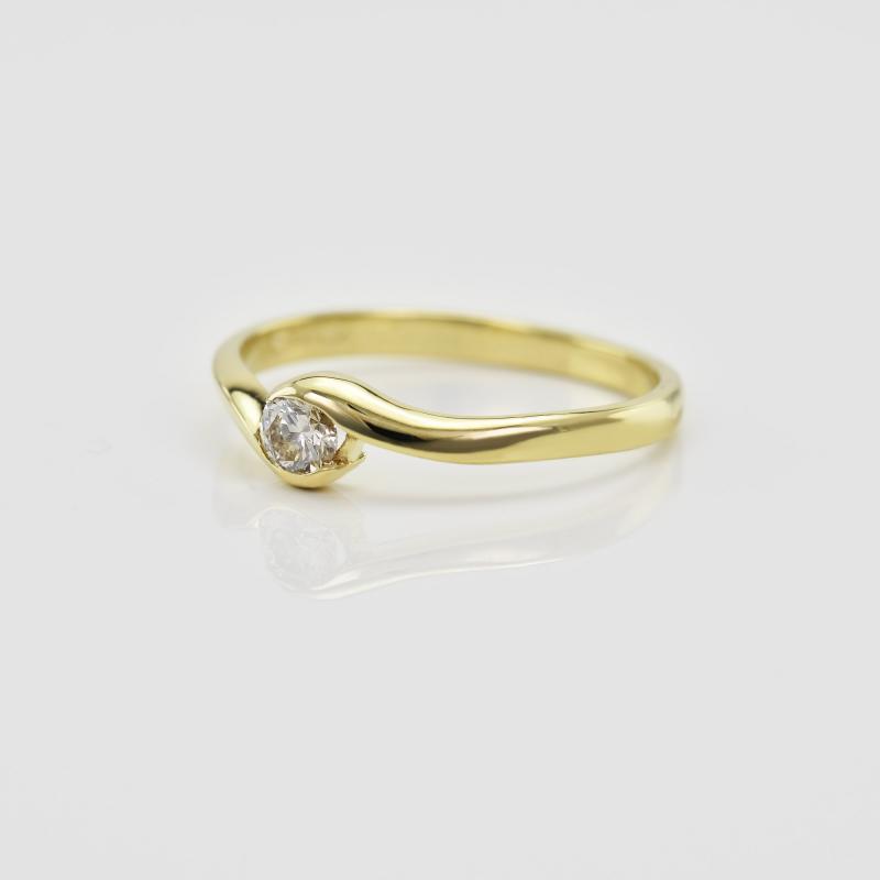 • der Ring aus Gelbgold schließt in einer geschwungenen Fassung einen Diamanten als Solitär ein