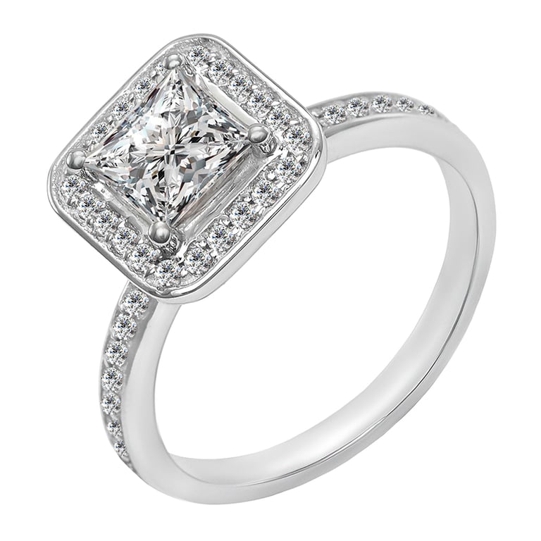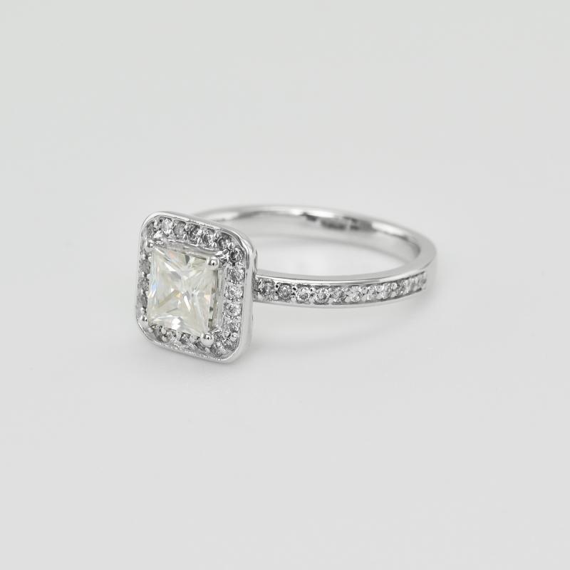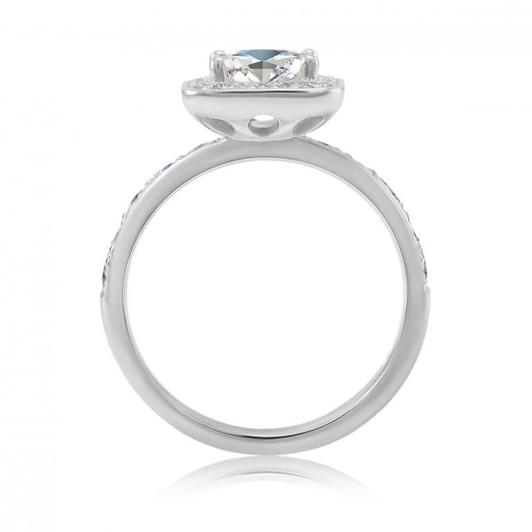 • die Halofassung ist extravagant durch die Form und die markante Einfassung und den leicht erhobenen Diamanten