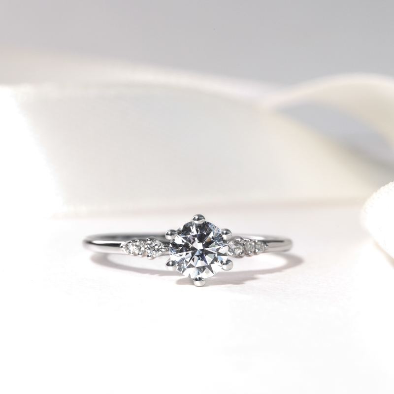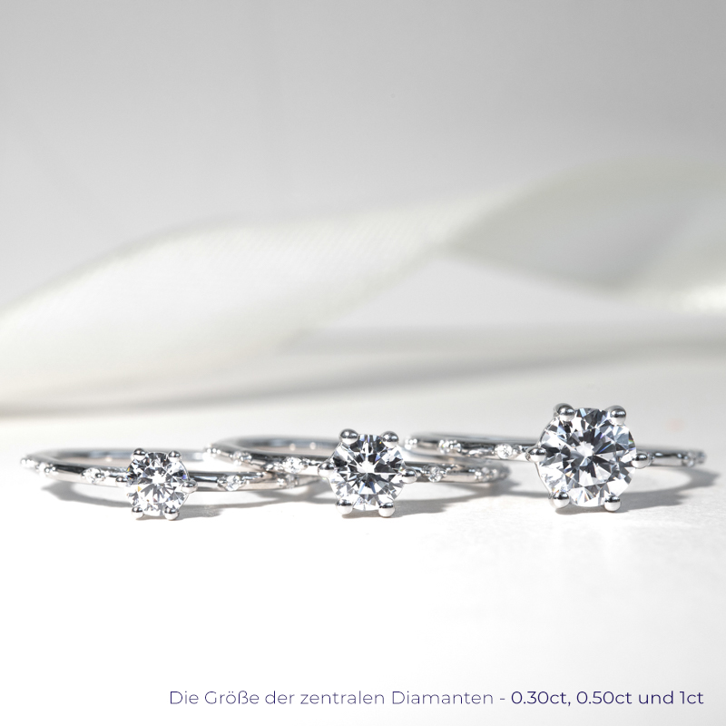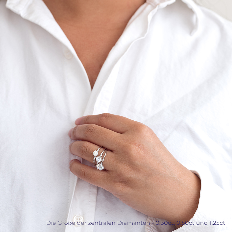 • der Glanz und die Brillanz des zentralen Diamanten wird durch jeweils drei seitliche Diamanten unterstützt