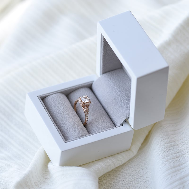 • ein Diamant im Cushionschliff und die umgebenden Diamanten strahlen durch den Kontrast mit Roségold