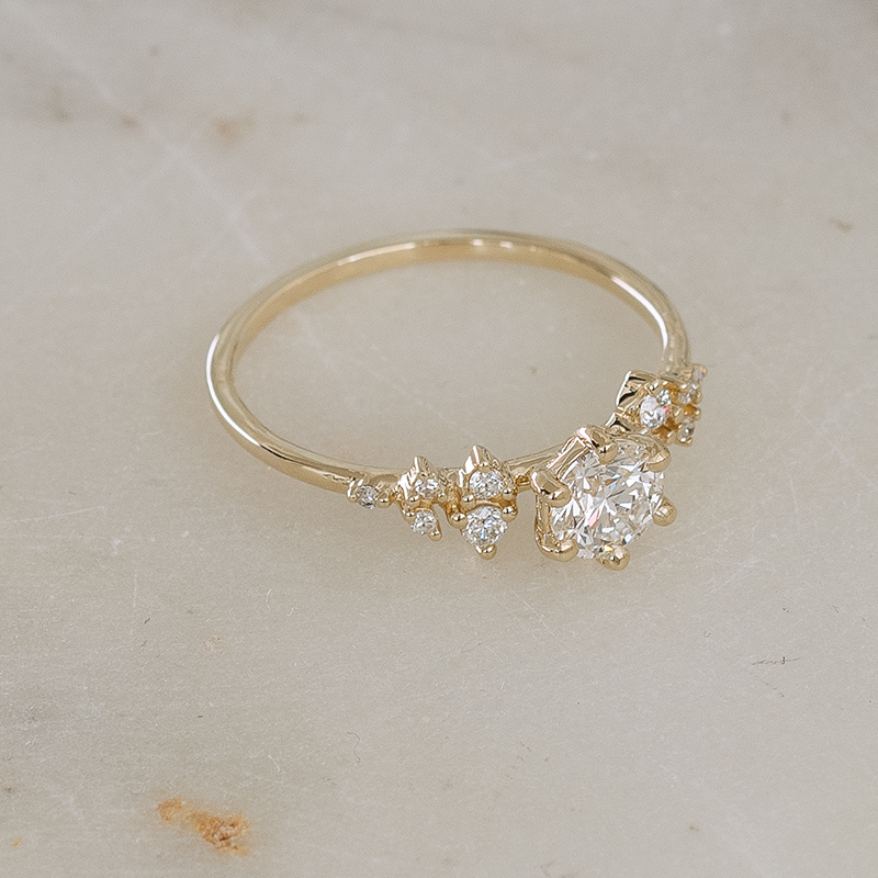• ein Verlobungsring aus recyceltem Gold oder Platin mit großzügig funkelnden natürlichen Diamanten