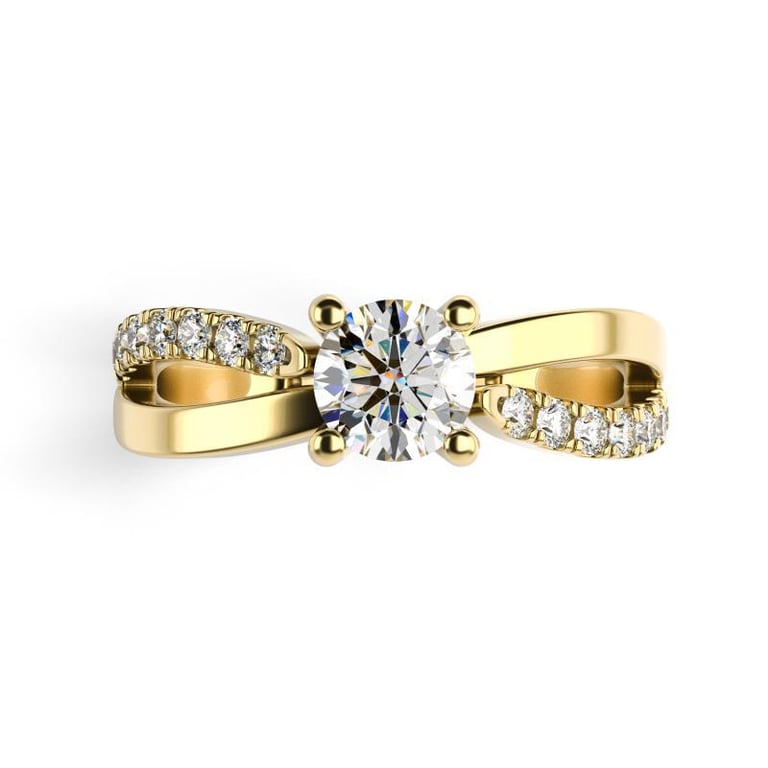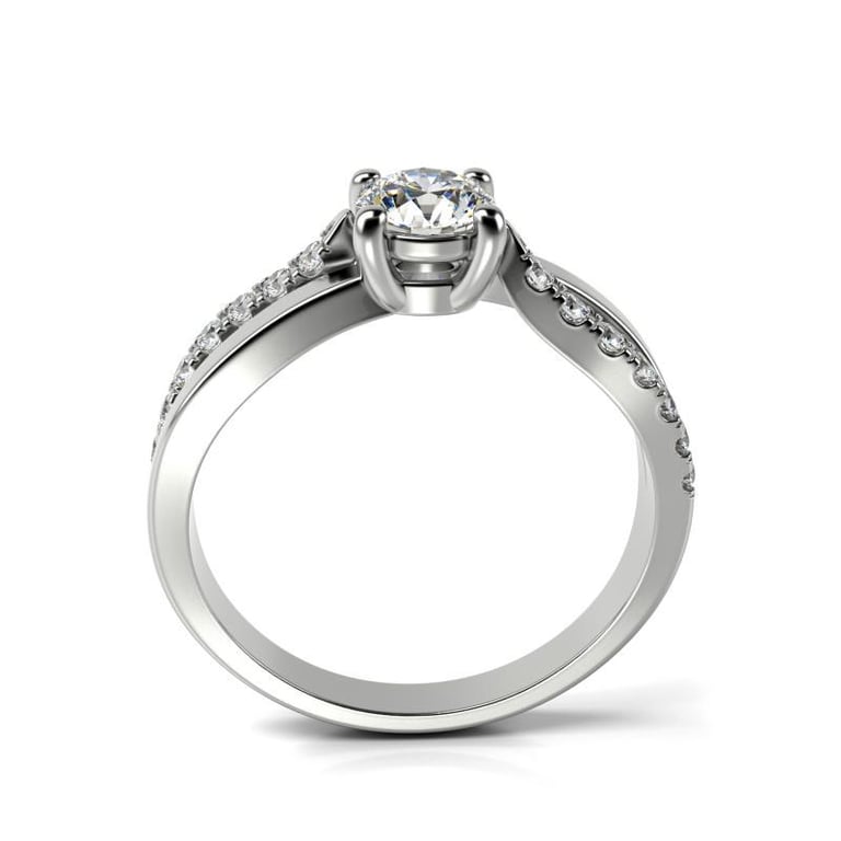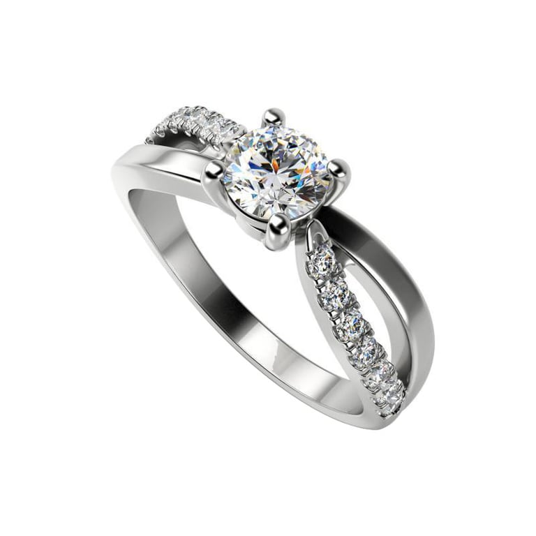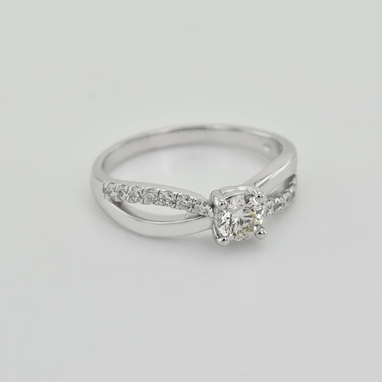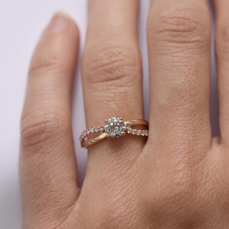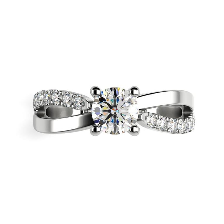 • die geteilte Ringschiene mit Diamanten umfasst den zentralen Diamanten wie eine Schlaufe
