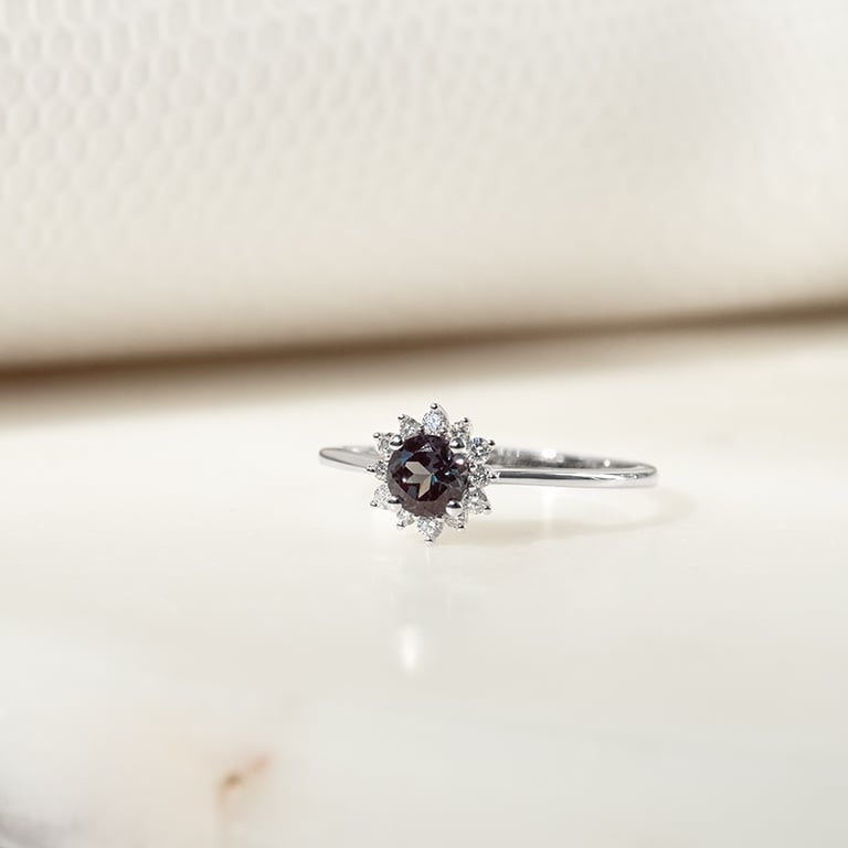 • der Ring wird von einem atemberaubenden blau-violetten Alexandriten in runder Form dominiert