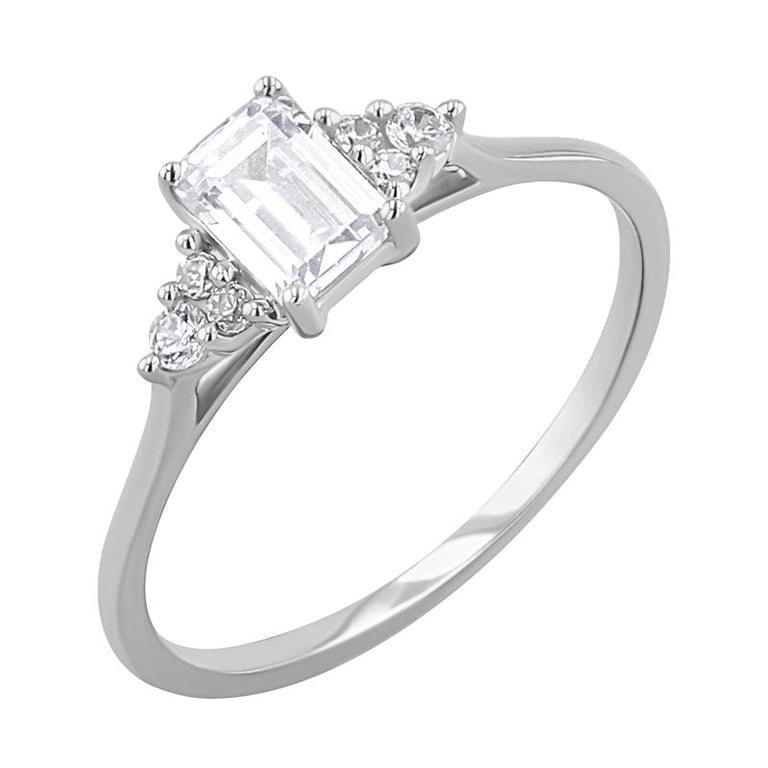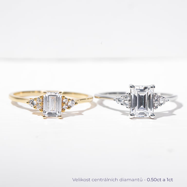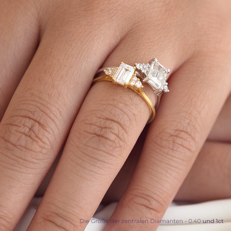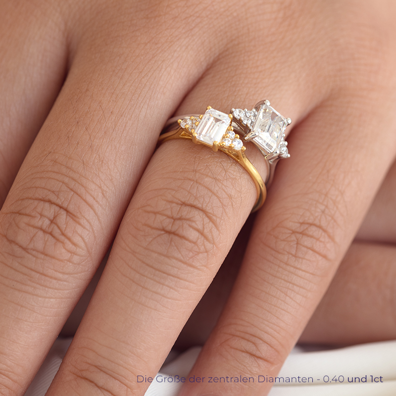 • 6 seitliche Diamanten bringen den zentralen Diamanten in Emerald-Form zum Funkeln