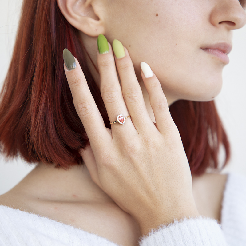 • der zentrale Lab Grown Diamant in Tropfenform verfügt über einen leicht rosa Ton