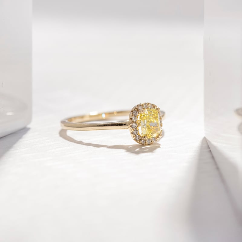 • der leuchtend gelbe Lab Grown Diamant mit IGI Zertifikat bezaubert durch seine perfekte Kissenform (cushion)