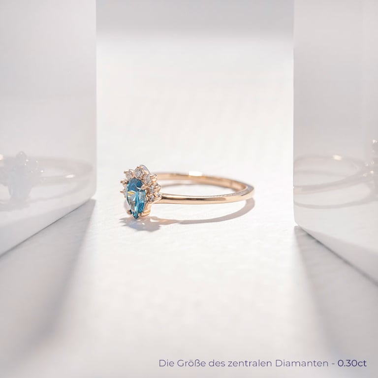 • die Dominante des Rings bildet ein tropffenförmiger blauer Lab Grown Diamant