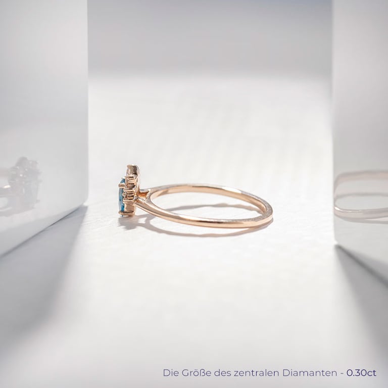 • weiße Lab Grown Diamanten, die den blauen Stein umrahmen, geben ein extra starkes Funkeln
