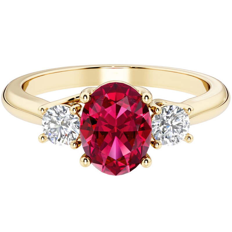 • ein im Labor hergestellter Rubin schimmert zwischen zwei weißen Diamanten durch