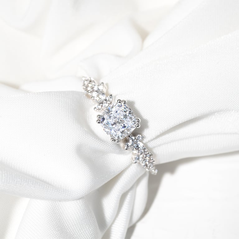 • der kissenförmige Moissanit in der Mitte und die 24 Diamanten an den Seiten sorgen für ein einzigartiges Design und ein reiches Funkeln