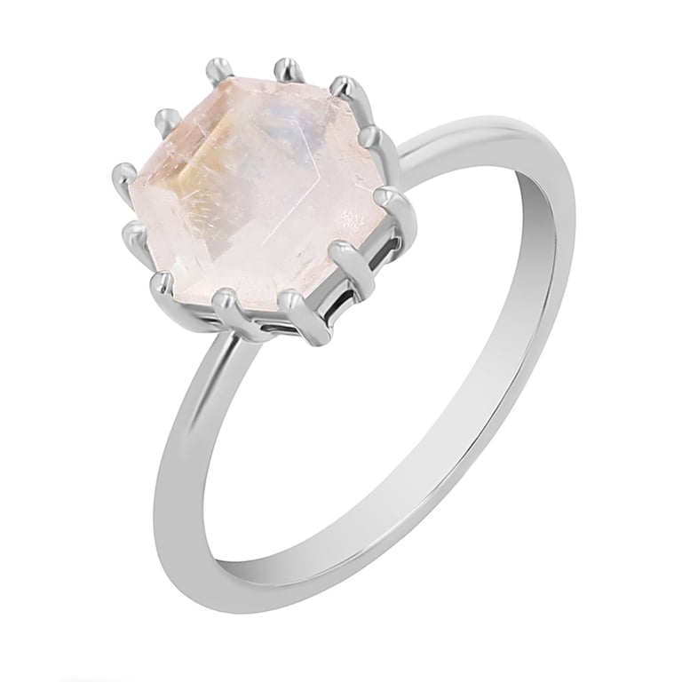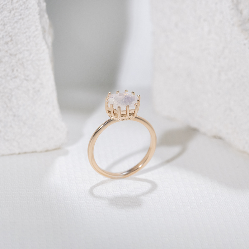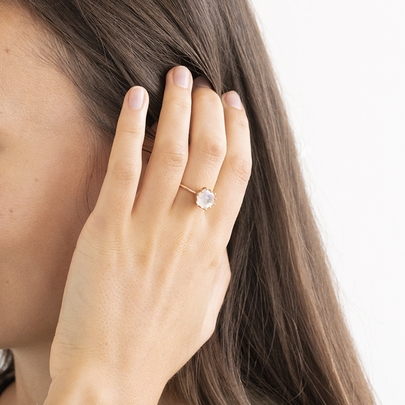 • den Ring schmückt ein Mondstein in einem einzigartigen weißen Farbton, der in allen Regenbogenfarben schillert