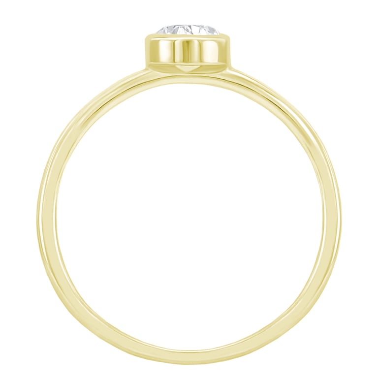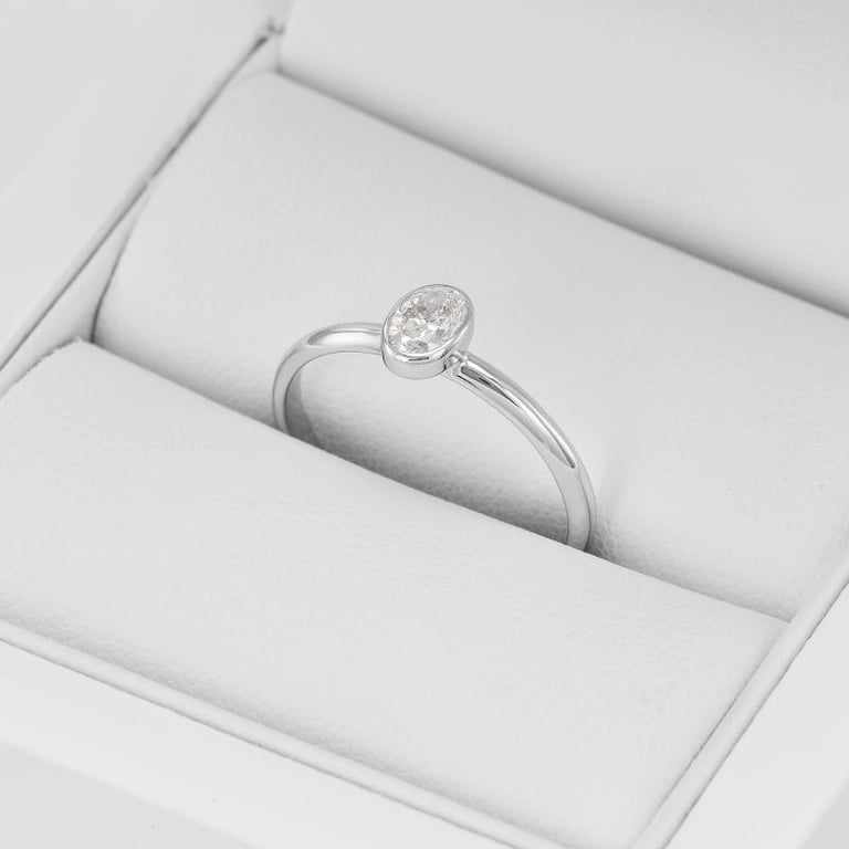 • ein ovaler Diamant ist hier in einer Bezelfassung gefasst und thront auf einer zarten Ringschiene
