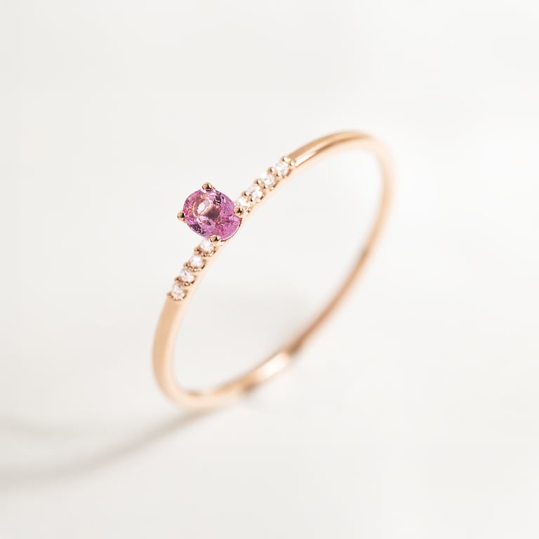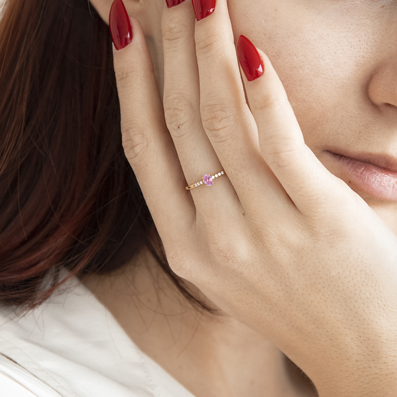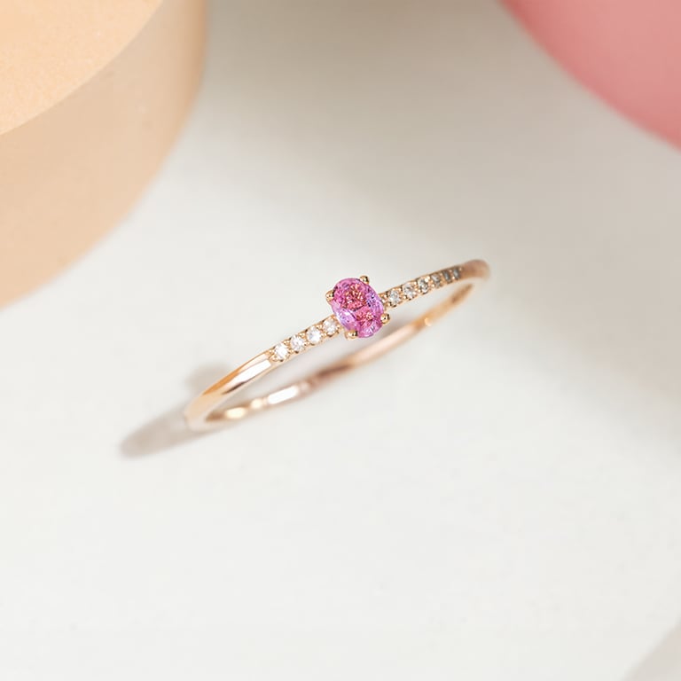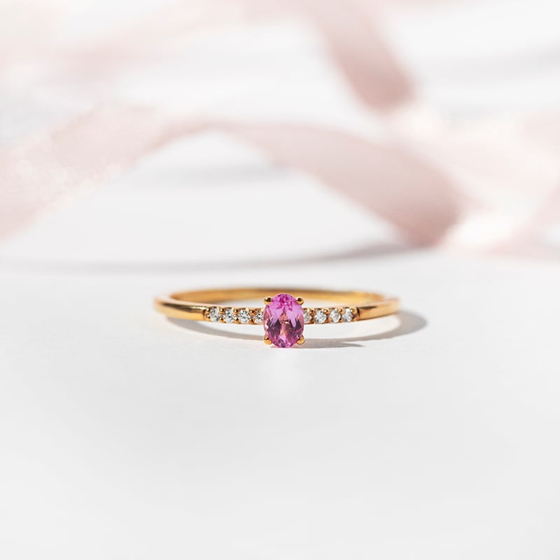 • der zentrale rosafabene Saphir wird von 8 seitlichen Lab Grown Diamanten umrahmt, die die Natur schonen